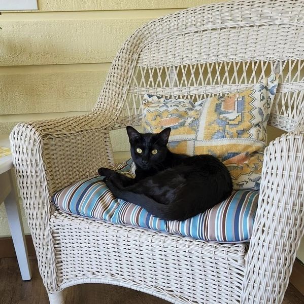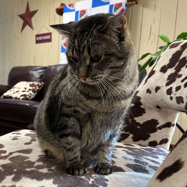 Tabby is the oldest member of our ranch cats whom we also adopted from the ARL in Marshalltown. Although she doesn’t enjoy playing with her brother, her favorite thing to do is keep Debbie company in the office sharing her desk chair!