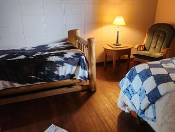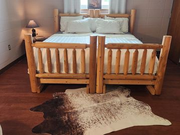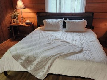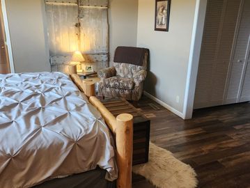 1 king size bed, 2 single bunk beds, private bath and laundry